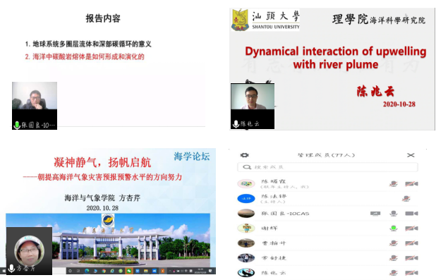 2020年10月28日下午,海洋与气象学院举行了第十期海学论坛,这次论坛有幸邀请到了中国科学院海洋研究所研究员、国家优青张国良老师以及汕头大学海洋科学研究院的陈兆云教授,同时和我院的方杏芹教授都作了十分精彩报告。论坛由陈法锦院长主持,采用线上进行的方式,学院及学校部分师生参会人数近百余人。